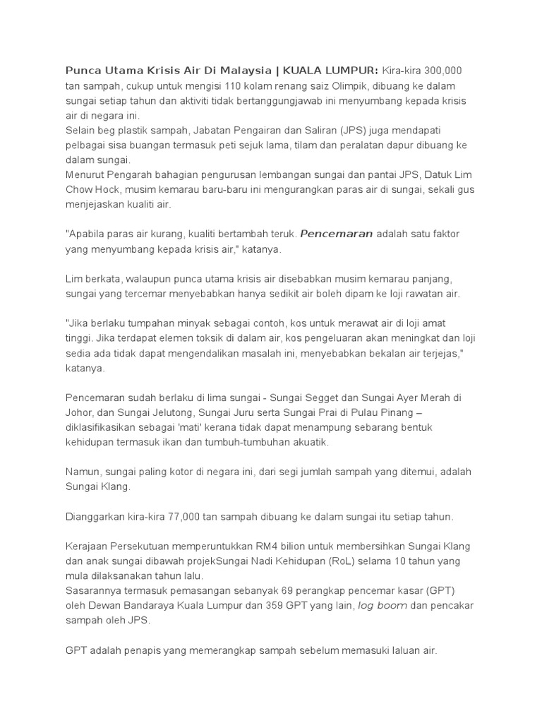 View Punca Krisis Air Di Malaysia _ Malaysiapdf from AA 111152019 Punca Krisis Air Di Malaysia Malaysia 1Sampah sarap - Sungai yang tercemar menyebabkan hanya sedikit air. 7 minutes ago by. PUNCA KRISIS AIR DI SELANGOR BAHAGIAN 1.
